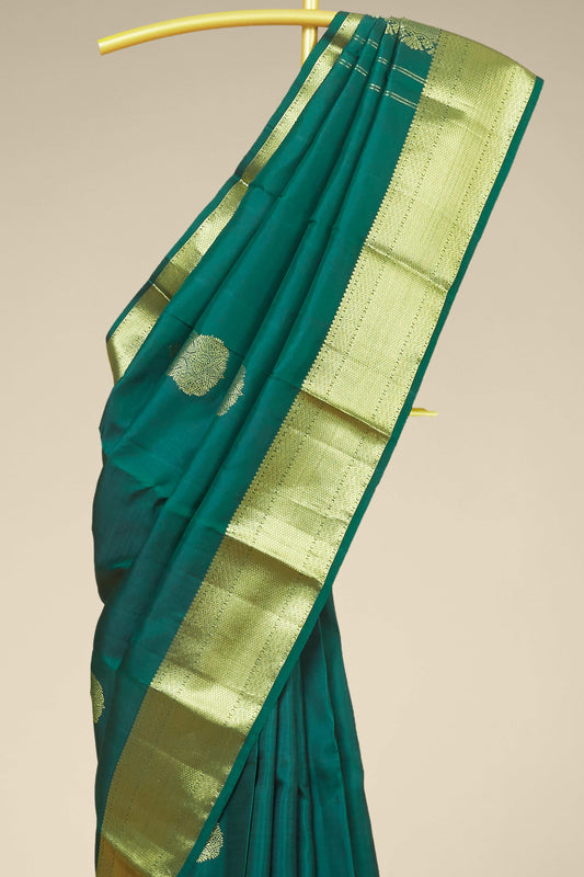 SaleKanchipuram Traditional Silk Saree in Bottle Green with Gold Zari Buttas and Self Border.