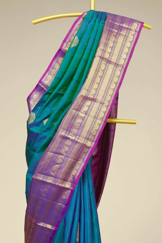 Sold outKanchipuram Traditional Silk Saree in Teal Blue with Purple Contrast Border
