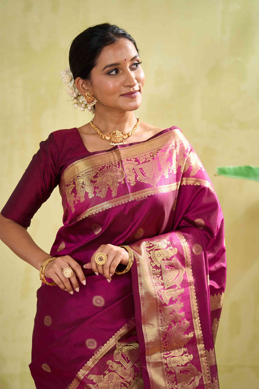 Sold outKanchipuram Traditional Silk Saree in Magenta with Gold Zari Buttas & Self Border