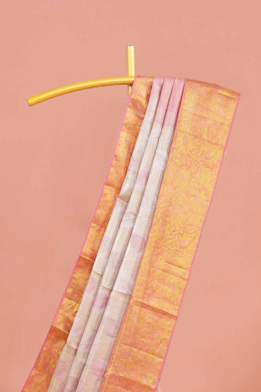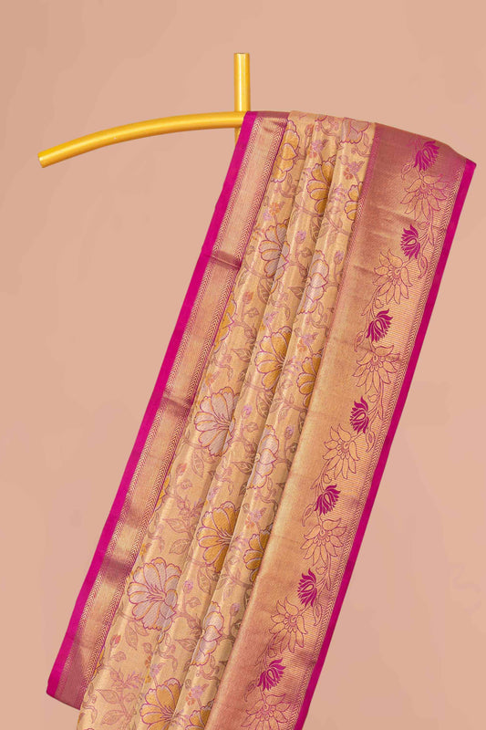 SaleBeige Tissue Kancheepuram Pattu With Magenta Zari Border And Floral Woven Design