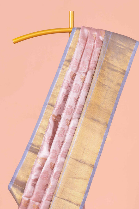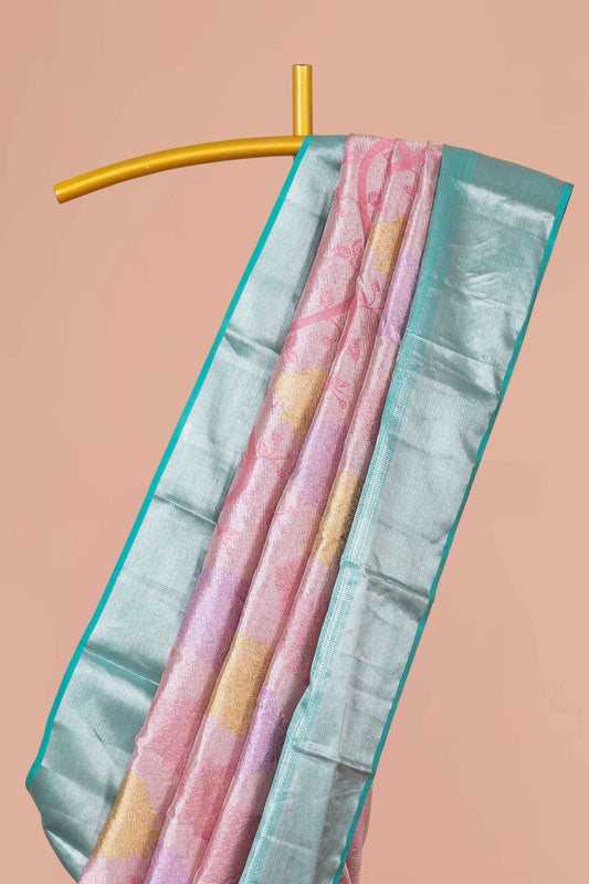 SalePastel Pink Tissue Kancheepuram Pattu With Silver Zari Border And Elegant Pallu Design