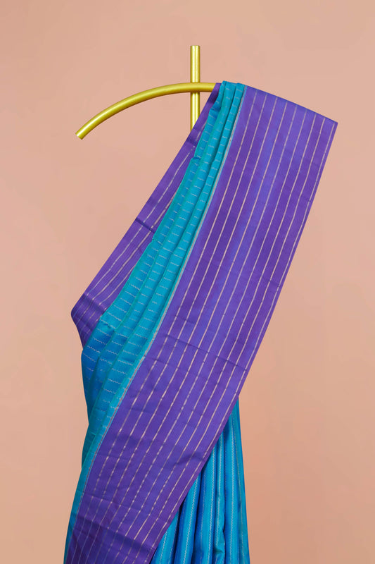Sold outKanchipuram Vairaoosi and Checks Silk Saree in Peacock Blue with Contrast Purple Border and Golden Stripes