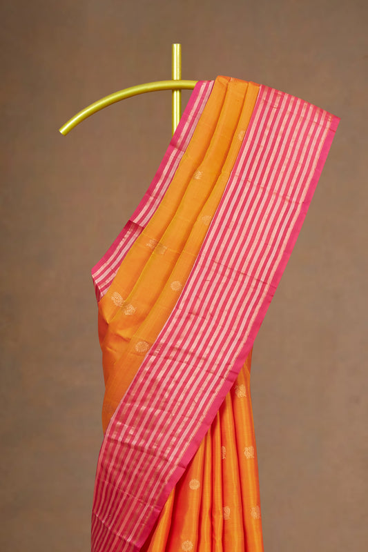 SaleKanchipuram Vairaoosi and Checks Silk Saree in Bright Orange with Contrast Pink Border and Body Buttas