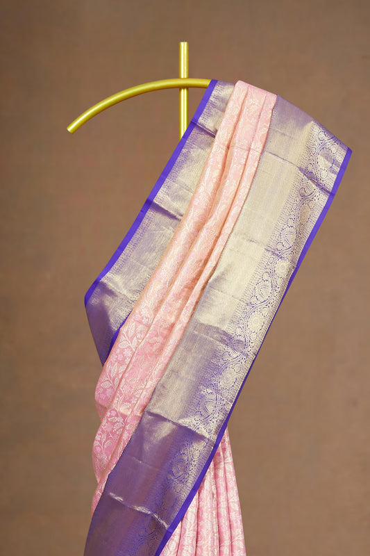 SaleTurquoise Blue Kanchipuram Silk Saree with Intricate Silver Zari Buttas and Purple Contrast Border