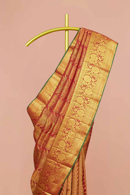 SaleOlive Green Pure Kanchipuram Silk Saree with Handwoven Gold Zari and Rich Maroon Contrast Border