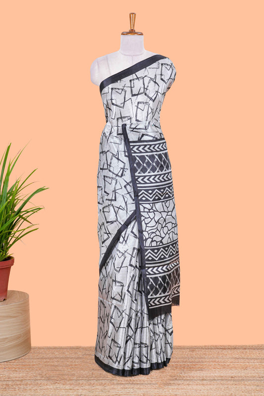 Grey Khadi Cotton Geometrical Print Design In Body And Pallu