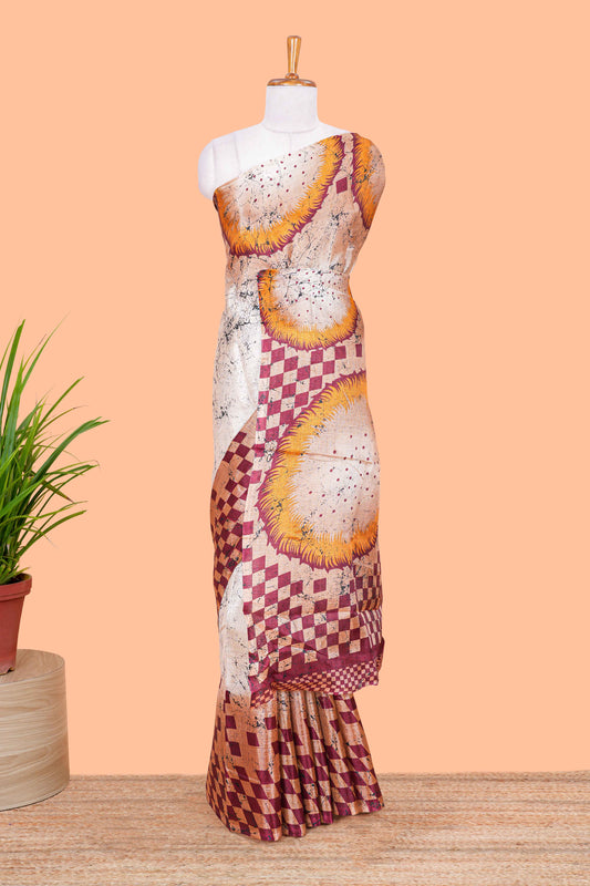 Maroon With Cream Khadi Cotton Body Border And Pallu Geometrical Print Design