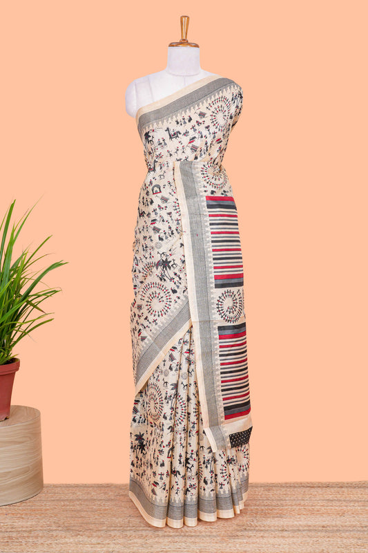 Sandal khadi cotton saree with warli print design on body and pallu