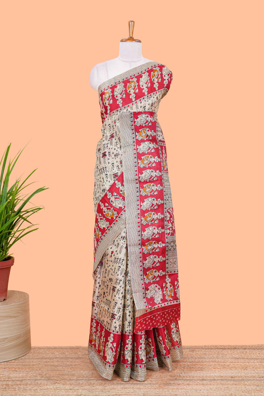 Cream khadi cotton saree with green kalamkari print on body and pallu
