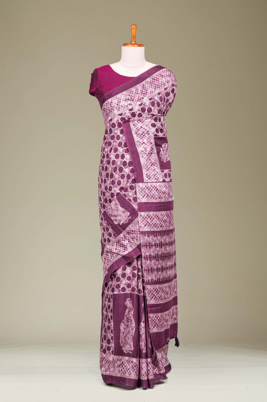 Purple Linen Saree Geometric And figurative Motifs Printed Across The Body Along With Geometric Design Blouse
