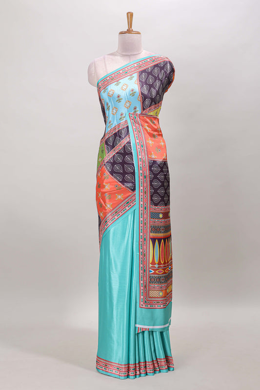 Turquoise green geometric pattern & floral design masakali saree with self border and matching blouse