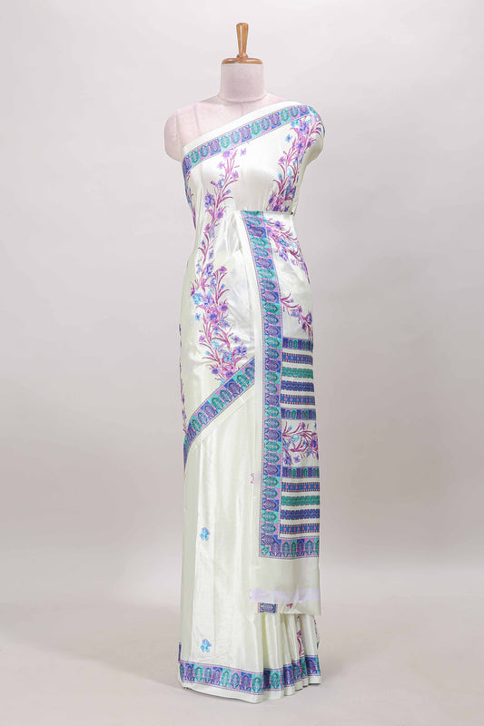 Cream floral print georgettte saree with self floral design border matching striped pallu