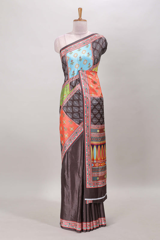 Chocolate brown geometric pattern & floral design masakali saree with self border and matching blouse