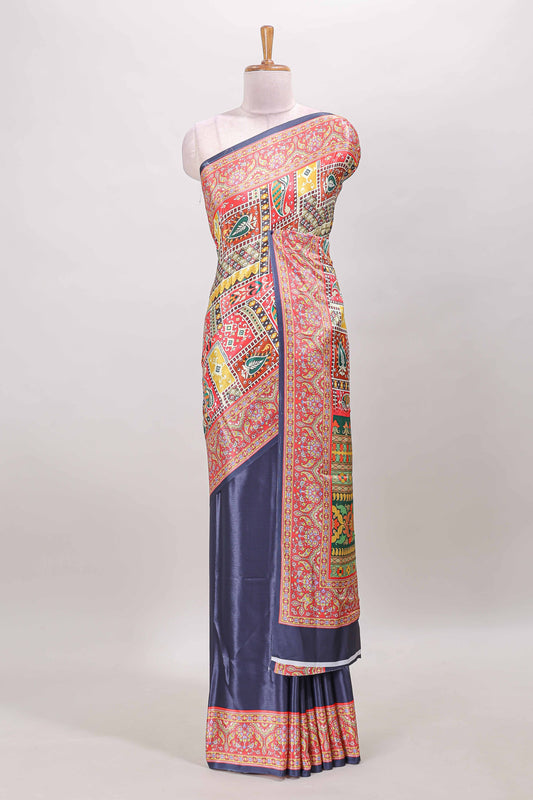 Navy blue geometric & ikkat design masakali saree with self border and matching blouse