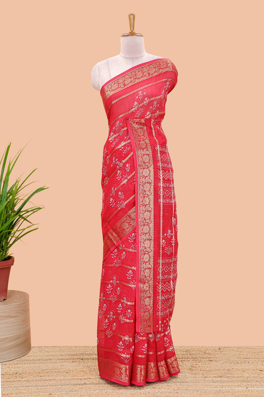 Red striped marsh georgette saree with floral motifs and printed pallu and blouse