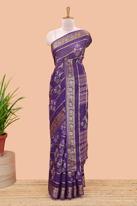 Purple striped marsh georgette saree with floral motifs and printed pallu and blouse