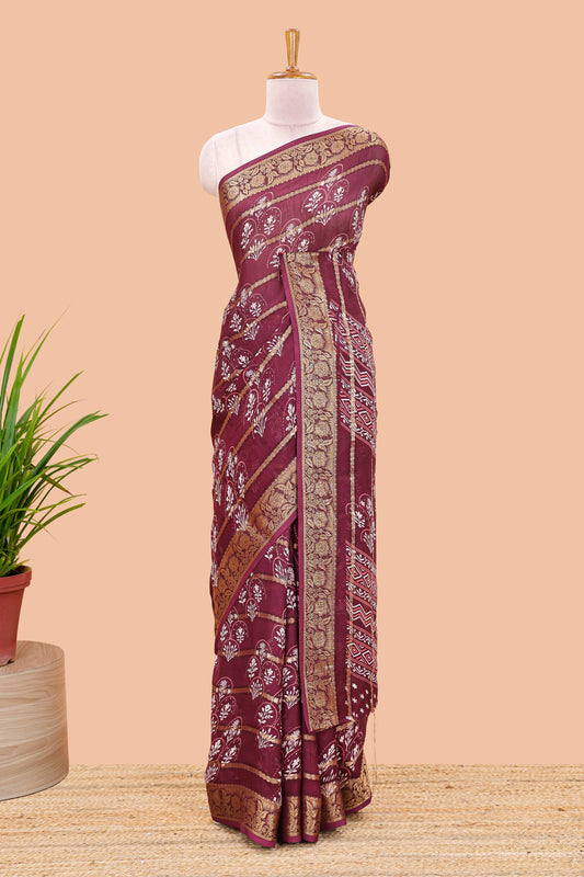Marron striped marsh georgette saree with floral motifs and printed pallu and blouse