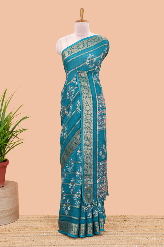 Blue striped marsh georgette saree with floral motifs and printed pallu and blouse