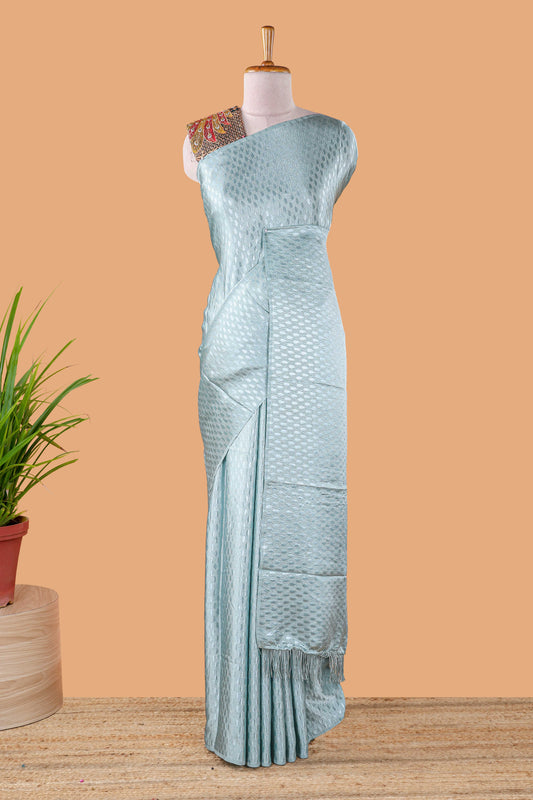 Borderless blue Jacquard Satin Georgette Crush Saree paired with a contrast blouse featuring exquisite peacock embroidery