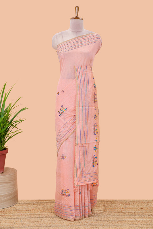Peach chanderi cotton saree with all over warli style tribal couple embroidery and hand stitched line work