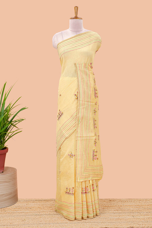 Mustard chanderi cotton saree with all over warli style tribal couple embroidery and hand stitched line work