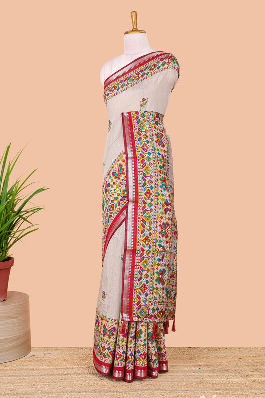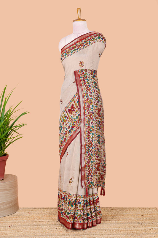 • Cream chanderi cotton saree with geometric floral butta, red zari border and patola inspired mirror work