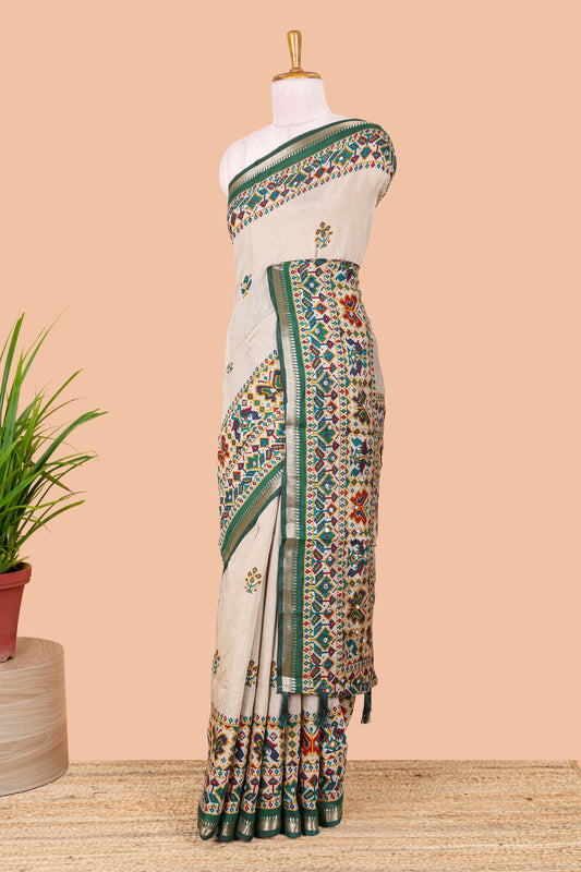 • Cream chanderi cotton saree with geometric floral butta, green zari border and patola inspired mirror work