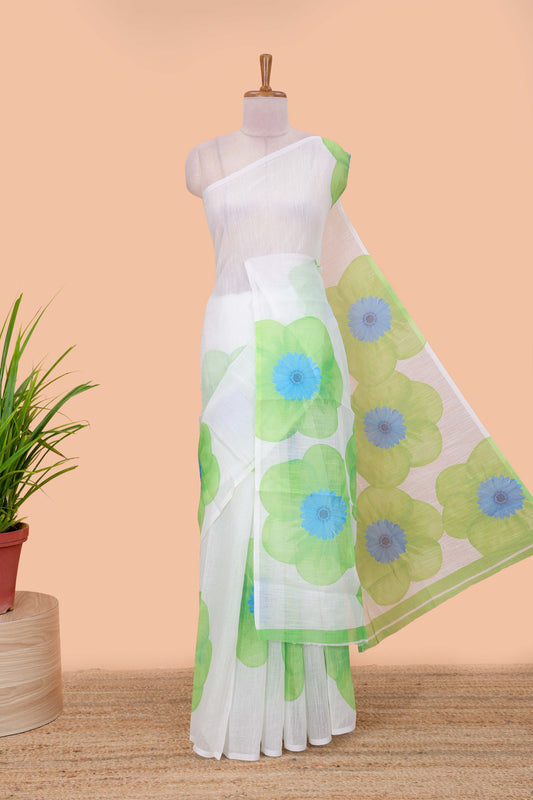 Borderless white linen cotton floral print saree with contrast blouse