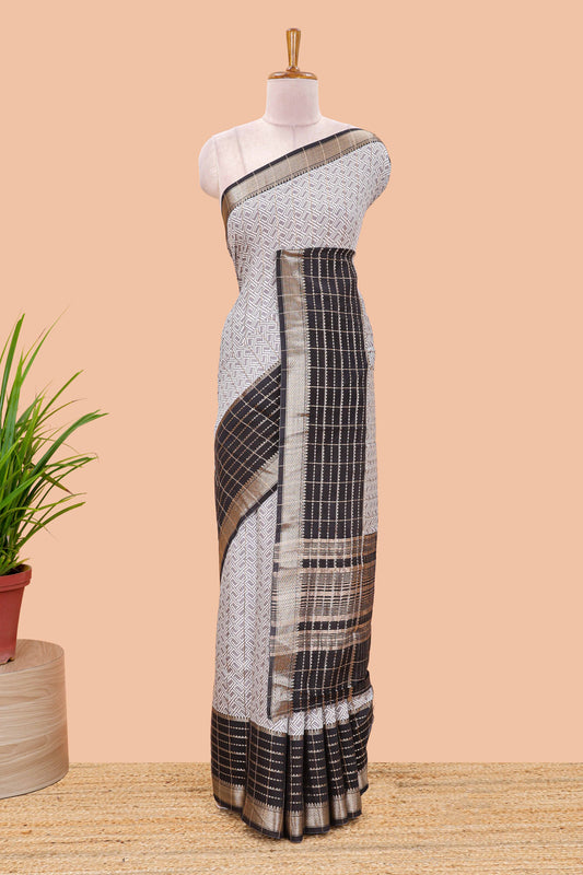 Grey assam silk saree with geometric print, contrast border with zari checks, and Pallu