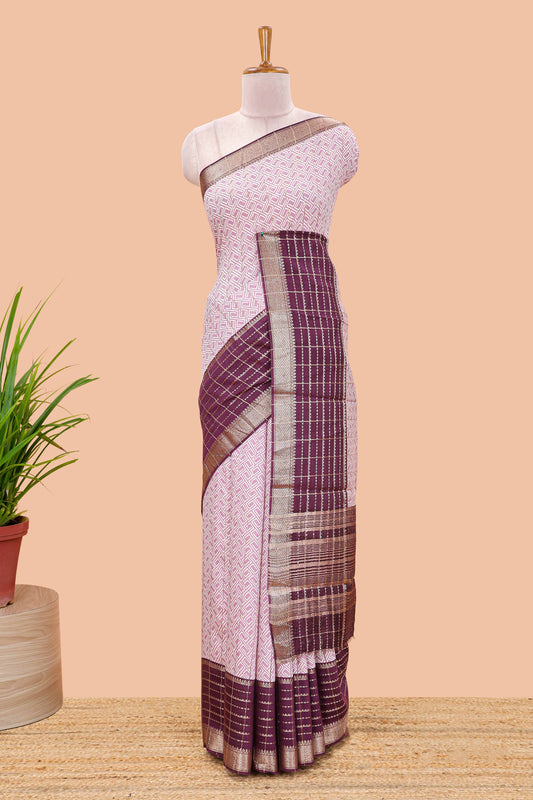 Purple assam silk saree with geometric print, contrast border with zari checks, and Pallu