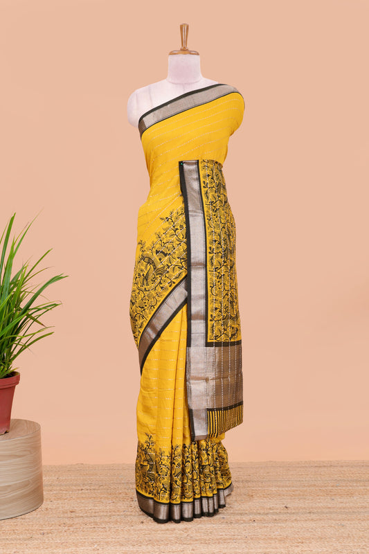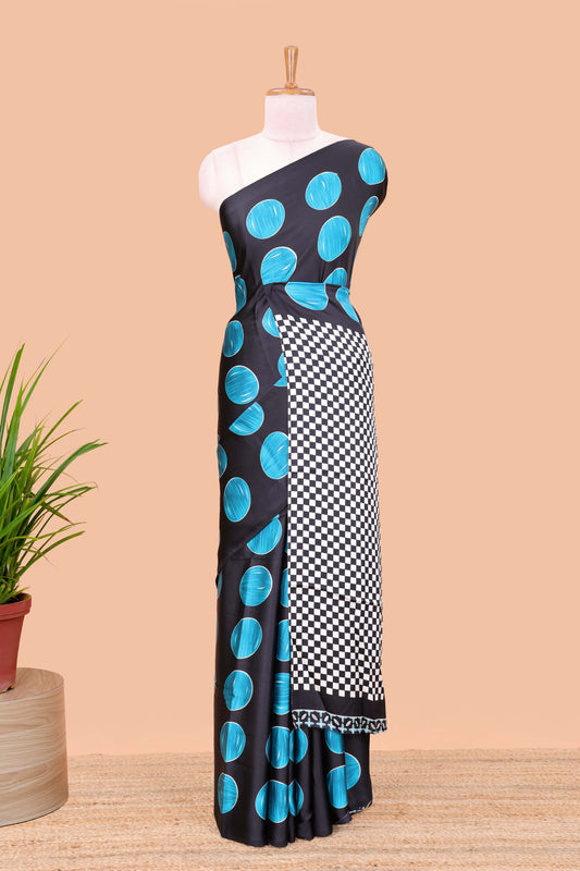Black satin modal saree with blue polka print, contrast checked pallu, and printed blouse