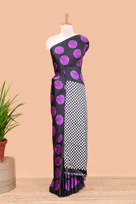 Black satin modal saree with purple polka print, contrast checked pallu, and printed blouse