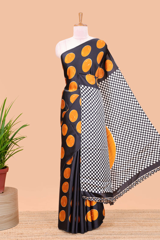 Black satin modal saree with orange polka print, contrast checked pallu, and printed blouse
