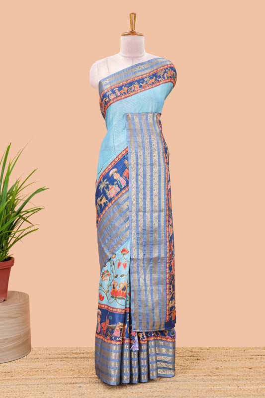 Blue dola silk saree with lotus bird creeper print and village themed pallu