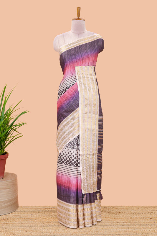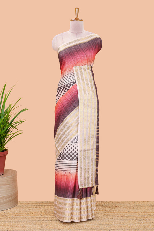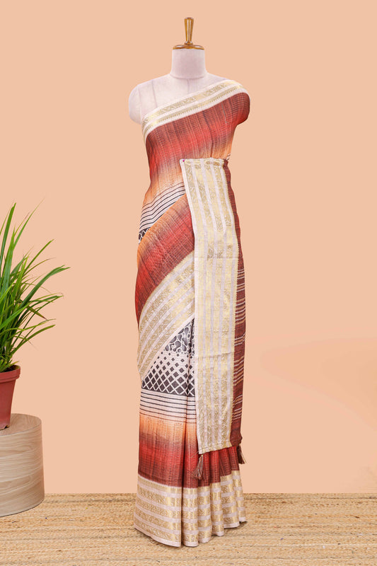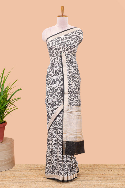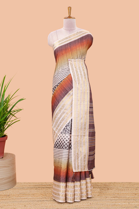 Cream assam silk saree with all over ikkat style print, contrast stripe pallu and zari border