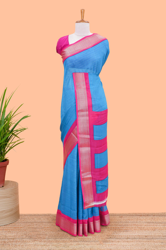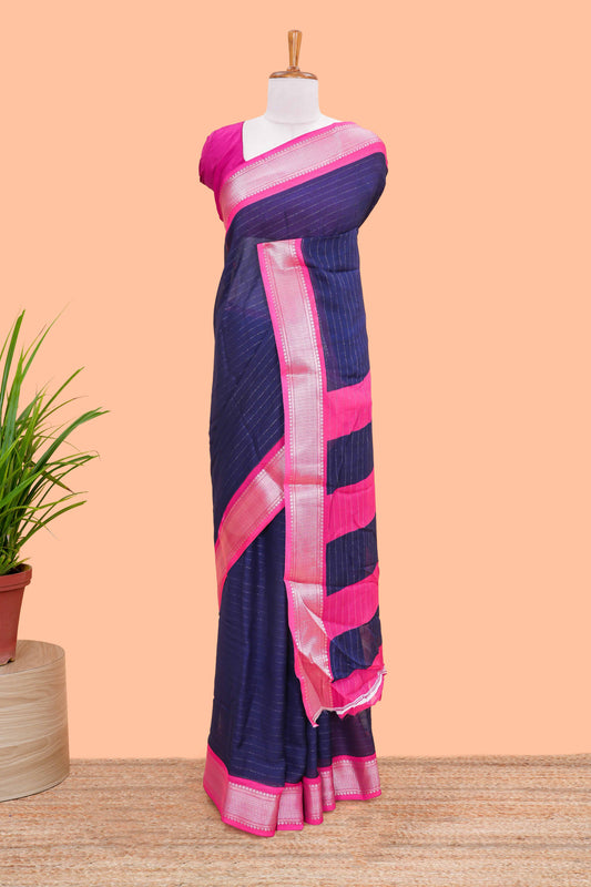 Ramar blue stripes crepe chiffon saree with contrast border and blouse