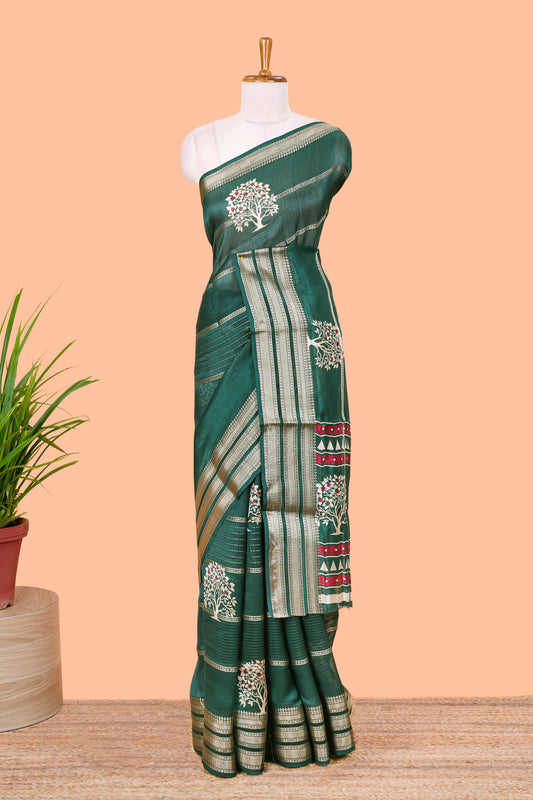 Green Striped tree butta moss chiffon saree with self triple zari border and matching blouse