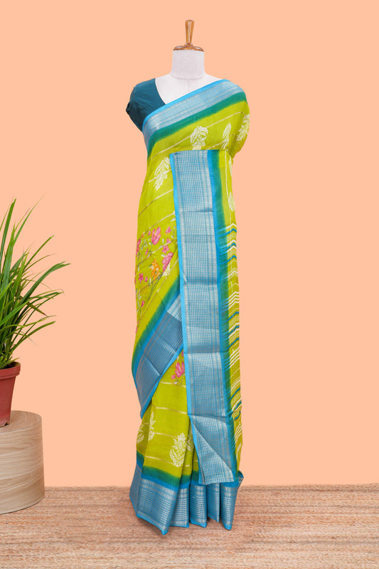 Green striped floral design chiffon georgette saree with contrast border and matching blouse