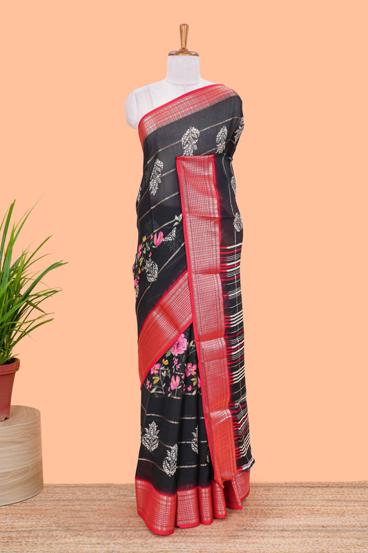 Black striped floral design chiffon georgette saree with contrast border and matching blouse