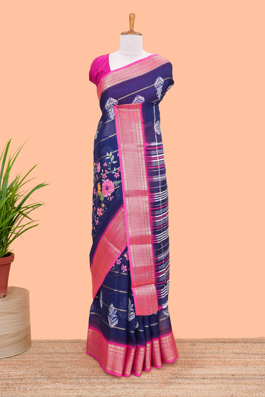 Blue Striped floral design chiffon georgette saree with contrast border and matching blouse