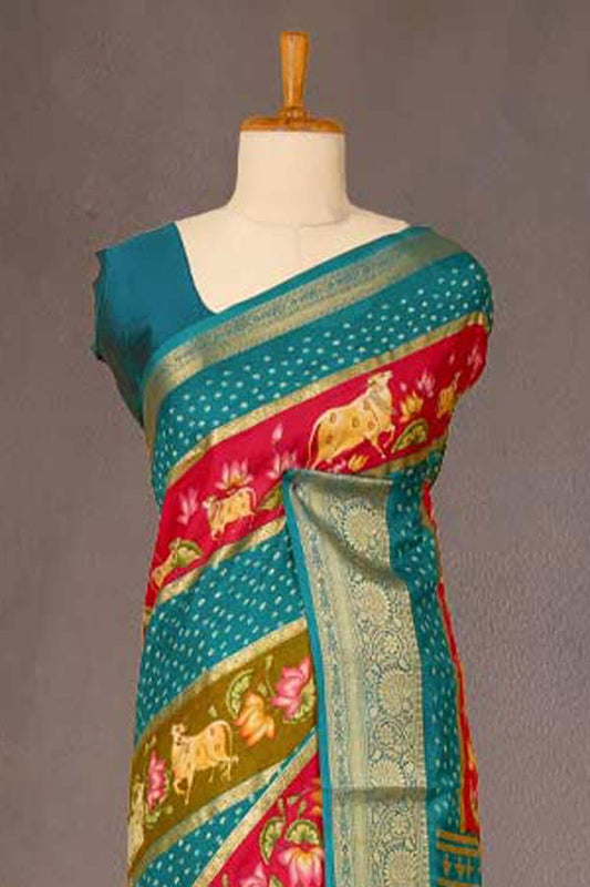 Semi Banarasi Printed Saree Multi Colour Saree With Kalamkari Printed Jacquard Border Along With Blouse