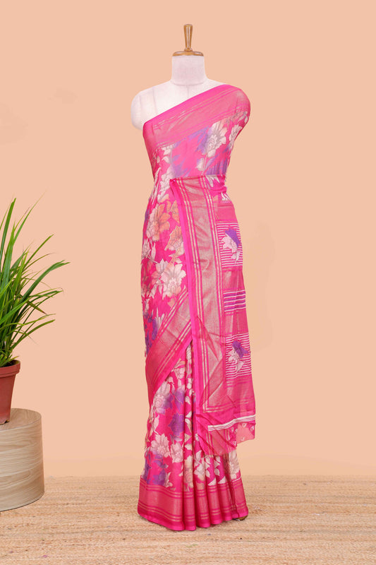 Rose pink moss chiffon floral print saree with gold zari border and pallu