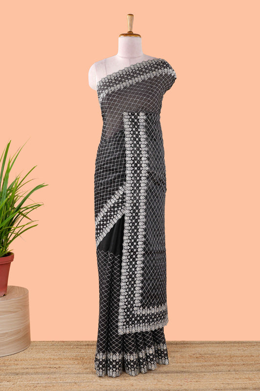 Black geomentric fendi chiffon embroidery design saree with self pallu and blouse