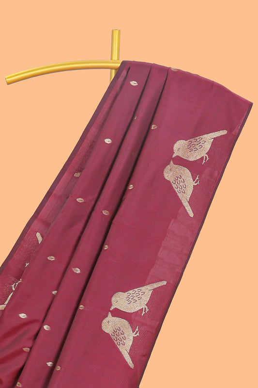 Borderless maroon leaf zari butta and birds design semi soft silk saree with self pallu and matching blouse