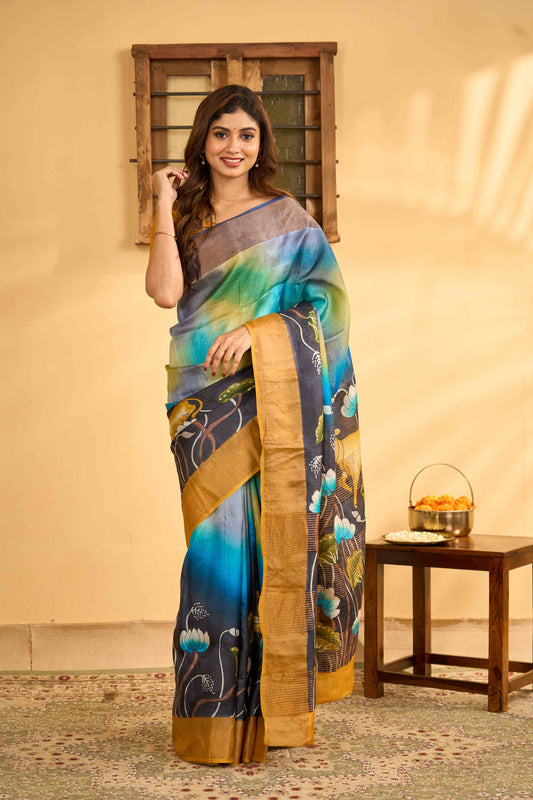 SaleTussar Silk Printed Pure Saree in Blue & Green Ombre with Golden Border and Nature-Inspired Motifs