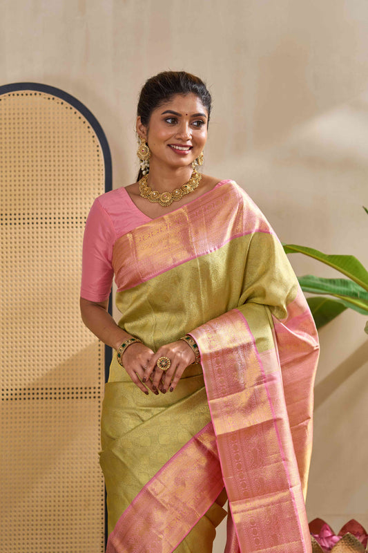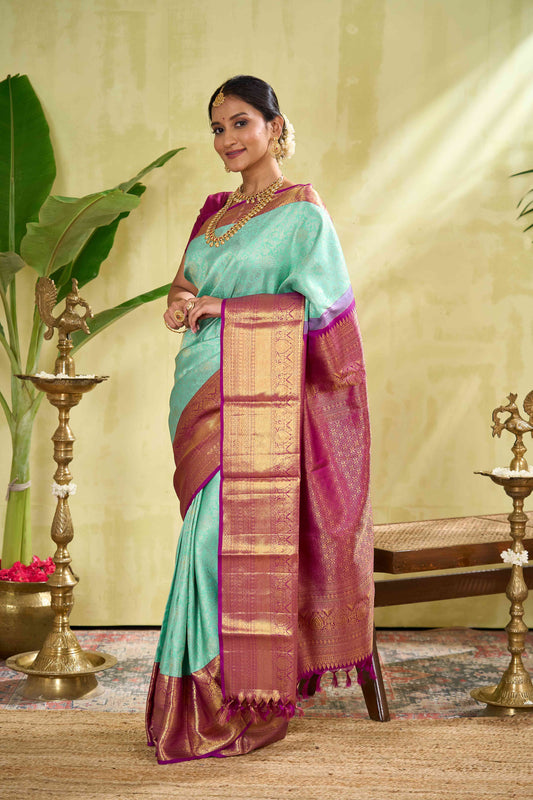 SaleMint Green Jacquard Work Swayamvara Pattu Saree with Contrast Pinkish-Maroon Zari Woven Border & Traditional Golden Pallu