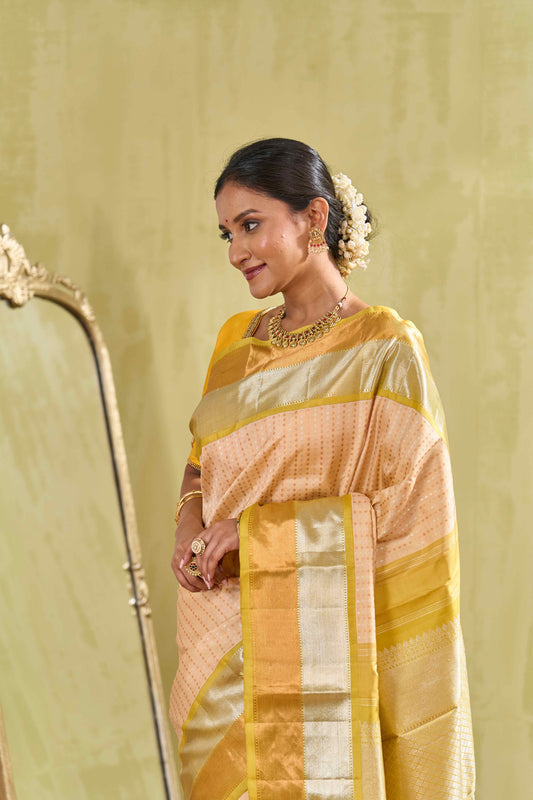 SaleCream Jacquard Work Swayamvara Pattu Saree with Golden Zari Woven Border & Silver Highlighted Pallu
