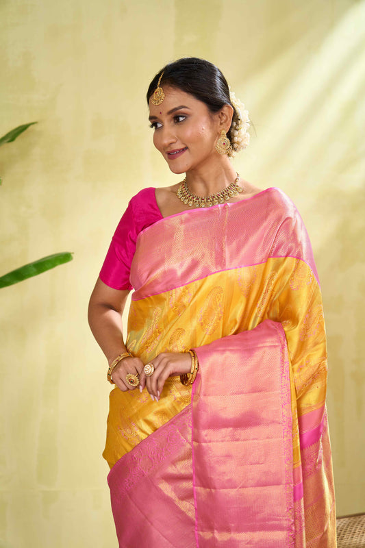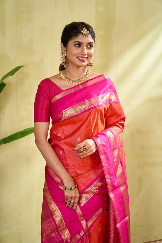 Sold outKanchipuram Vaira Oosi Silk Saree in Bright Pink with Gold Zari and Contrast Magenta Border