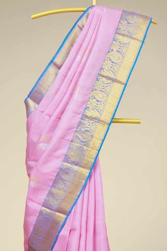 SaleKanchipuram Traditional Classics Saree in Deep Purple with Gold Zari Border and Contrast Pink Edging