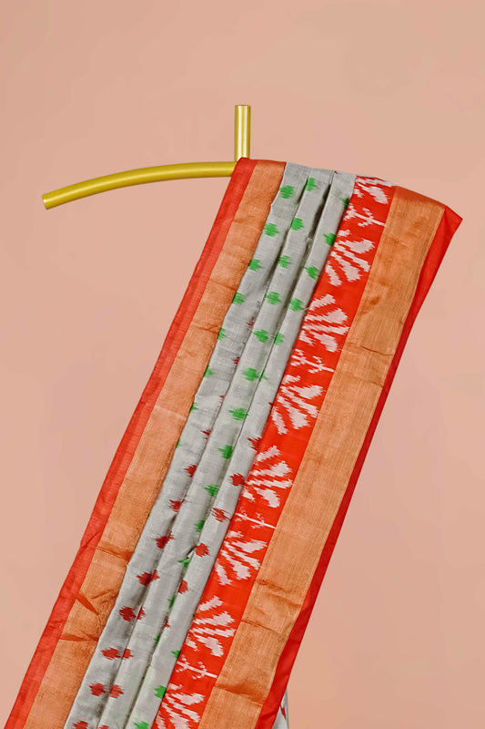 SaleHandwoven Mint Green & Orange Pure Ikkat Silk Saree with Traditional Floral Buttas and Contrast Temple Border